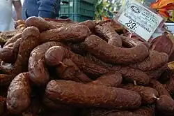 Spišské párky is a smoked dry sausage contained in sheep intestines (of <24 mm) with a weight of about 50 grams. The main ingredient is pork, but it also contains beef. The sausage is seasoned with sweet and hot paprika, which gives it a slightly spicy taste and a "pinkish-red" colour.[4]