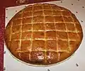 Belokranjska pogača is a pogača (a type of flatbread) mainly produced in Metlika and the wider Bela krajina region. It has a diameter of ca 30 centimeters and is 2 (edges) to 4 (middle) centimeters thick. It tastes best when it still warm directly after baking.[63]