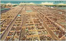 Union stockyards in the United States were centralized urban livestock yards where multiple rail lines delivered animals from ranches and farms for slaughter and meat packing. A stockyard company managed the work of unloading the livestock, which was faster and more efficient than using railway staff.[1] Terminal stockyards received, handled, fed, watered, weighed, held, and forward-shipped commercial livestock.[2] The Chicago Union Stock Yards were the most famous and enduring example of this type of commercial complex. They are considered one of the chief drivers that empowered the animal–industrial complex into its modern form.[3][4] Stock yards also existed in Canada. Livestock from ranches in Mexico and points south were sometimes driven to American stockyards.