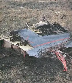 Wreckage of Sea Harrier XZ450, piloted by Lt. Nick Taylor, destroyed by AA fire. XZ450 made the Sea Harrier's maiden flight on 20 August 1978.