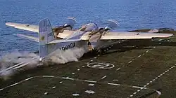 Argentine Naval Aviation Grumman S-2G Tracker taking off from the aircraft carrier ARA Veinticinco de Mayo. -