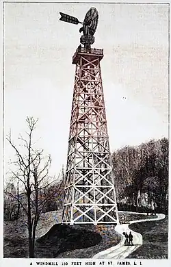 | Butler Windmill | St. James | Tower | 1894[18] | 150 foot high tower, the Andrew J. Corcoran-designed spider legged windpump was built to be the strongest and highest in the world, the water was pumped to a reservoir a mile away to Prescott Hall Butler's estate. A.J.Corcoran Co. built windmills (See Bourne Windmill) and Butler was a NY Attourney. The Butler windpump brand added improvements to the technology of windpumps in 1897, 1898 and 1905[19] |
