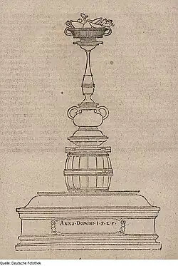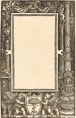One of the earliest list of woodcuts by Dürer was assembled in 1808 by Adam Bartsch in his "Le Peintre Graveur" volume 7[1] and in the appendix. In 1862 Johann David Passavant expanded "Le Peintre Graveur"[2] adding additional woodcuts. Bartsch and Passavant works, which were organized alphabetically, are the source of "B." and "P." numbers, referenced by all the later books.[3][4][5][6] Another often cited reference is 1903 "Catalogue of Early German and Flemish Woodcuts in the British Museum, Vol. 1" by Campbell Dodgson[6] organized by date and often referenced using "C. D." numbers. In the list below numbers used in 1938 "Albrecht Dürer: Complete woodcuts" (German: Albrecht Dürer: Sämtliche Holzschnitte) by Otto Fischer[4] were provided, as this book offers a catalog of most Dürer woodcuts printed in the original size.