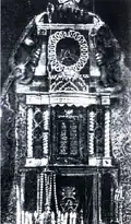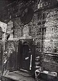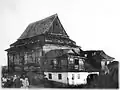 1775–1917 | The building consisted of an almost square main hall. To the west was an arcade with an entrance to the vestibule and a room above, which could have been a prayer room for women. There were lower extensions along the south and north sides, probably also with the women's prayer rooms. At the corners to the west were two lower corner pavilions. These had a two-tier pyramid roof. The main building had a hipped roof and above, slightly offset, a gable roof. The gable was designed in the baroque style. The extensions on the sides had pent roofs. The main hall had two twin windows on each of the three outer sides; the rest of the rooms had smaller, rectangular windows. The ceiling of the main hall had a vault that reached into the roof structure. The bima had the shape of an octagonal, baroque arbor with high wooden columns and was surrounded by a balustrade. The Torah shrine was two-tiered with an attachment that protruded into the vault. It narrowed towards the top and pillars on the sides were decorated with floral motifs. | ![]() ![]() ![]()