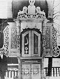 1744–1943 | The rectangular synagogue had a hipped roof with a smaller gable on the west. The roof protruded well beyond the building and was supported on all four sides by wooden pillars. In the west there was a vestibule and another room at ground level. This was followed by the main hall, the men's prayer room. Above the vestibule and the adjoining room was the women's prayer room, which was accessible via an outer staircase. In the middle third of the stem was another small stem. The main hall had rectangular windows, the other rooms had smaller, square windows. The bima in the form of an octagonal arbor stood almost in the middle of the main room and was surrounded by a balustrade. The Torah shrine on the east wall was framed by a pair of columns and had a top with a crown. After 2014, a replica was built in the open-air museum for folk architecture in Sanok 150 km away.[34] |