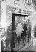 A barrel vault seven meters high and a floor space of around eight by nine meters rose above the wood-paneled prayer room. Adjacent to the main room was the prayer room for the female parishioners, which was separated by a diamond-shaped lattice. There were living rooms above it. In 1732 the synagogue was beautifully painted by the Galician painter Eliezer Sussmann. The paintings were depictions of the Jerusalem Temple and copies of Hebrew legal texts. Numerous valuable cult objects were kept in the synagogue, including a very old Torah scroll from the Jewish community of Herrieden, which was dissolved in 1681, several old Torah pennants and the memorandum of the Jewish community from 1729. During the Nazi era, the first desecration occurred in November 1936 when the synagogue and several Jewish houses were smeared with red paint. Although the synagogue was listed, it was burned down with its precious rituals during the November pogrom on November 9, 1938. The ruin was removed a little later. The synagogue property came into the possession of the municipality of Bechhofen. In the 1980s, a memorial was set up on the property. A memorial stone with an inscription plaque was placed in the middle. |