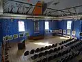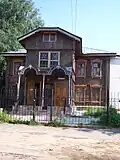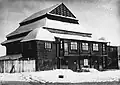 The synagogue is a wooden log structure of rectangular plan, built on a rough-stone concrete foundation and divided into two floors in the west. The structure is spanned with a hipped rafter roof covered with tin. On the exterior, the building is protected with horizontal weather-boarding above the windowsills of the prayer hall, and a vertical one below them.[13] A prayer hall of almost square plan is situated on the eastern side. On the western side, the building includes a vestibule and a small room with a stove, which also heated the prayer hall. A staircase in the southwestern corner leads to a women's section on the first floor, which opens to the prayer hall with two long rectangular windows. The main entrance to the building is in the western wall and the women's entrance is on the southern wall. Ten round-headed windows opened from the prayer hall: three windows on the southern and northern walls and two pairs of windows on the eastern wall. The windows of the vestibule and the women's section are rectangular. The ceilings are joisted flat constructions; that of the prayer hall is supported by two large beams, resting on the western wall of the women's section and the eastern wall of the prayer hall.[14] |