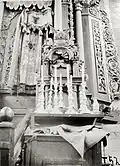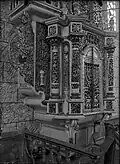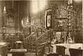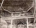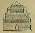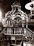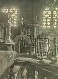 It consisted of a square (12 × 12 m) large main hall. The walls were 6 m high; it was 10.20 m to the highest point of the vault, and the floor was a few steps lower than the outer rooms. On the west side there was a vestibule and above it a gallery with arcades. A two-story corner pavilion stood to the right and left. The north and south sides were flanked by women's dreams. The main building had a three- story tent roof, with the upper step transitioning to an octagonal point. The corner pavilions had a two-story roof. Inside, four wooden pillars supported the vault; they divided the floor plan into nine equally sized fields. In the middle stood the bima; it was in the shape of an octagonal arbor with a canopy with a crown on the top. | ![]()
