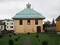 1780–1939 | The main hall was on the west side and a two-story gallery at its corners in the south and north. This was originally open, during the renovations in 1905 it was closed with a wooden panel. Access to the upper floor was via two symmetrical stairs on the sides. Between the gallery and the main hall there was still the vestibule and a smaller room and another room as a (small) prayer room for women. The large women's prayer room was located above this. The main hall (the men's prayer room) had two twin windows with round arches on the outer walls. The two-tiered mansard hipped roof was divided by a small step and was closed at the bottom by a frieze. The extensions of the gallery at the corners had their own little gable roofs. The men's prayer room was almost square with 11.90 × 12.10 m; the wall height was 7.60 m and the height to the top of the dome was 13.80 m. An octagonal dome had been built into the roof in two steps; at the bottom it was divided into eight trapezoidal elements and at the top into triangles. The bima under the dome had an arbor shape (also octagonal). An older Torah shrine was replaced by a new one (probably in the 19th century). This was in the shape of a narrow cupboard with double doors and small pillars. Above it was a double-headed eagle with a crown, which probably came from the original Torah shrine. | ![]()