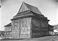 | Ros', Grodno | 1700s–???? | A photograph from the beginning of the 20th century shows that it was also a two-tiered building. Its core consisted of a ritual room close to a square. At the level of the first tier, auxiliary rooms were located under a pitched roof, covering the main volume along the perimeter. In comparison with Leonpol synagogue, this one was approximately twice as large in volume. The length of the walls at the level of the first tier was about twenty meters, and at the level of the second - about twelve. The walls were made of hewn beams, in a clean corner, and had horizontal planking. The windows in the upper tier were high, doubled, with bow-shaped ends, with wide platbands. They sat symmetrically about the vertical axis of the building. The entire building ended with a high roof with a wide baroque pediment, sheathed with herringbone planks, with an arched window with six glass panes. The roof had a tattered covering, which also created a colorful texture and was in contrast to the smoothly sheathed walls.[4] | ||