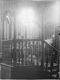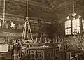 1775–1941 | The main hall, which was 12.60 × 12.60 m square, was located a few steps lower than the rooms surrounding it on three sides. Up to the beginning of the vault it was 7.60 m and up to its top 13.50 m high. The much lower extensions were the vestibule in the west and the women's prayer rooms in the south and north. There were also two corner pavilions in the west, the walls of which were the same height as the walls of the main hall. The buildings were constructed from horizontal beams and their design shows that all parts of the building were built at the same time. The entrance to the vestibule was through two symmetrically placed doors on the west side, the entrance to the main hall was then through a door in the middle. Small stairs on the sides led to the corner pavilions; from there, there was an entrance to the women's rooms. The upper levels were accessed by stairs in the vestibule. The main hall had two pairs of (high) rectangular windows on each side. Similar but smaller windows were in the women's rooms and on the upper floor of the pavilions. The roof of the main hall consisted of three levels: a lower mansard roof, a hipped roof in the middle and a gable roof above. A round window with a Star of David was built into the gable on the west side during renovations. The corner pavilions had pyramid roofs. The roofs of the women's rooms leaned against the sides to the south and north. The porch had transverse roofs; a kind of monopitch roof on each side and a gable roof in the middle. As a result, the windows on the west side, which were located in between, were not covered by the roof structure of the vestibule. The bima was an octagonal podium surrounded by a balustrade and was located in the center of the room. A few steps led to the Torah shrine on the east side. It was trapezoidal in shape with small pillars at the corners. The sides were decorated with floral motifs and animals. Above was a structure with the tablets of the law held by lions and crowned by a crown. The walls were whitewashed; only the Torah shrine was multi-colored and the wooden bima was natural-colored. | ![]()