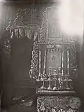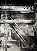 1790–1941 | The building was 28.5 meters long, 19 meters wide and 12.5 meters high. There was a separate section for women in the northern and southern part of the ground floor and in the gallery. The walls were richly decorated with biblical verses and prayers. The vault was especially richly decorated. Following the example of Polish landowners' seats, at the façade there were corner alcoves, often used in synagogues in the mid-18th century. Between the two wars, Professor Oskar Sosnowski of the Department of Architecture of the Polytechnic of Warsaw, and photographer and art historian Szymon Zajczyk directed architects to create extensive documentation of the wooden synagogues. They created architectural drawings, replica paintings, and photographs. Much of this project was destroyed during World War II but a substantial amount survived.[5] The synagogue in Hrodna was measured and photographed in 1928. | ![]() ![]() ![]()