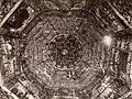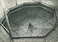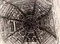 1770[1]: 62 –1913[27] | The layered, pitched roof visible in surviving exterior photographs conceals a series of massive trusses from which the great dome was suspended.[28] The roof, which features three well-defined stages, was considered one of the most architecturally complex and interesting of wooden synagogue roofs.[29] The synagogue was enlarged in the nineteenth century by the addition of one story extensions on each side for the use of the women of the community.[28]: 231–2 |