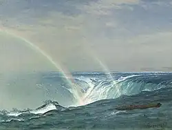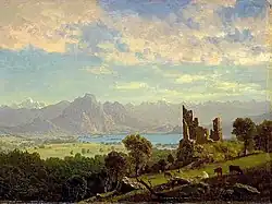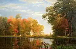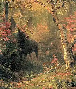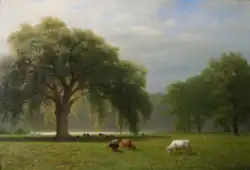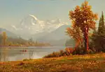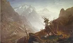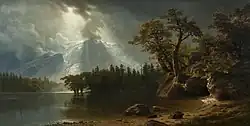 Bierstadt became part of the second generation of the Hudson River School in New York, an informal group of like-minded painters who started painting along the Hudson River.[1] Their style was based on carefully detailed paintings with romantic, almost glowing lighting, sometimes called luminism. Bierstadt was an important interpreter of the western landscape, and he is also grouped with the Rocky Mountain School.
