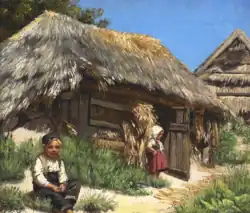 A thatched house. Summer day with warm blue skies. Arranged with a couple of children | 1871 | 20 × 34 cm | |||