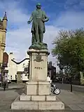1852 | The statue of Sir Robert Peel stands in Market Place, and the figure is by E. H. Baily. The monument has a shaped plinth of Aberdeen granite, with a shield and the name "PEEL" on the front, and bronze reliefs on the sides. On the plinth is the standing figure of Peel, also in bronze.[9][49] | II | |