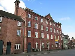 Late 18th century | The tape weaving factory and warehouse was built by J. & N. Philips, it was extended on a number of occasions, and is constructed in red brick with Welsh slate roofs. Part of the building runs along the south side of High Street. The block to the left is the earliest, it has two storeys, eleven bays, two of which are pedimented and contain a clock. Behind the pediment is a cupola containing a bell, the windows are casements, and the right two bays are angled and contain an elliptical-arched carriage entrance. To the rear at right angles, and added in 1822, is a long wing of four storeys, 27 bays long and five bays wide, and there are later wings at the rear. On High Street, to the right, and built in 1884, is a block with four storeys and eight bays. The middle two bays are flanked by pilasters, and are pedimented with a datestone. The outer bays also have pilasters and each contains a round-headed doorway.[4][31] | II* | |