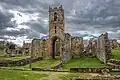 1398 | The ruined remains of a Carthusian priory are in stone, and consist of the great cloister to the north, the church, and the remains of the lay brothers' quarters to the south. The church has a nave, north and south transepts, a chancel, and a tower at the crossing. The tower has two stages, diagonal buttresses, tall bell openings with pointed arches, a moulded eaves band, and an embattled parapet with the remains of pinnacles. The courtyard wall contains the remains of monks' cells, each with a four-centred arched head, and a right-angled food opening on the side.[4][5] | I |