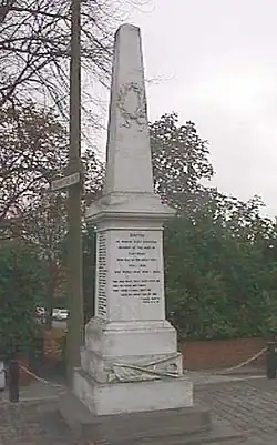 1921 | The war memorial is in an enclosure by a road junction. It consists of an obelisk on a plinth in Italian marble, on a two-stepped base of Whatstandwell stone. On the front of the obelisk is a carved wreath, and on the front of the plinth are carvings of a crossed rifle, a sword and a standard, and inscriptions. The other faces of the plinth have the names of those lost in the two World Wars. The area is surrounded by a chain link fence with a low brick wall at the rear.[15] |