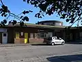 1938 | The railway station has a concrete frame with brick cladding, and is in Modernist style. It is in a single storey, and has a ten-bay front, the third to fifth bays being recessed. The flat roof extends to form a canopy. The entrance is in the seventh bay, and leads to the tiled booking hall, above which is a round drum. The windows have iron frames wit horizontal glazing bars.[51][57] | II |