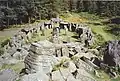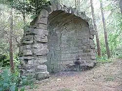 c. 1800 | A folly in sandstone intended to resemble a druids' temple. There are two circles, within which are an antechamber, a circular chamber containing a sacrificial stone, and a tomb. On the hill above is a tall column of stones symbolising a deity and the twelve signs of the zodiac.[5] |