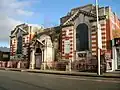 1901 | Originally an electric tram depot, later a bus depot, and then a transport museum. It is in red brick with some stone dressings and a slate roof. There is an office block at the front and a tram shed behind. It has two storeys, 15 bays and a wide splayed corner. The corner contains a wide round-headed window with a chamfered surround, voussoirs, and a carved keystone, with a clock face above. The windows vary; some are semicircular with gabled half-dormers above, and others have square heads.[15][24] | II |