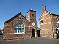 1872 | The school, later used for other purposes, is in red brick on a plinth, with dressings in gault brick and stone, lintel and eaves bands, cogged eaves, and roofs of lead and slate. There is a single storey, a T-shaped plan, and a main range of six bays. To the right is a square two-stage tower with a pyramidal roof and an iron ornament. It contains a doorway with a triangular head and a decorative lintel, above which is a lozenge-shaped datestone, and a clock face. To its left is a mullioned and transomed casement window, with a pointed-arched head, over which is a quatrefoil in the gable.[12][25] | II |