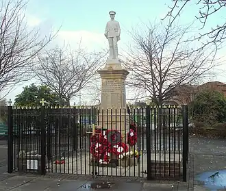 c. 1920 | Designed by Samuel Westby, the memorial consists of a yellow sandstone ashlar plinth carrying the white marble statue of a soldier at ease leaning against a broken tree stump. It is inscribed with the names of those who died, and details of its unveiling.[2][7][8][9] |