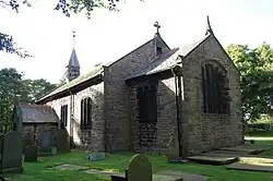 The church, located in Rivington village is built of irregularly coursed sandstone with quoins and a slate roof. It is a small plain building with a 19th-century gabled porch and an octagonal bell turret with a conical roof and weathervane.[10][11] | |