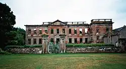 1744–47 | A country house that was badly damaged by fire in 1956, and is now roofless. It is built in red sandstone with quoins, a string course, eaves modillions, and an open balustraded parapet. There are two storeys and eleven bays. The central three bays project forward and contain a central doorway with alternate block surround, an entablature, and a pediment containing an ornament. The windows have stone architraves.[34][35] | II* |