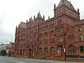 1896 | The former factory is in brick with dressings and detailing in terracotta and roofs in Welsh slate and tile. It has an L-shaped plan and an almost symmetrical front of twelve bays. It has four storeys, five-storey towers flanking the central bay and at the ends, and a two-storey bay at the extreme right. The central doorway has a round head and is flanked by polygonal attached columns with urns. In the towers are two-storey oriel windows, and elsewhere are mullioned windows, most also with transoms, some with round heads and others with flat heads. Along the top is a parapet and pinnacles.[22][23] |