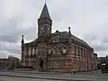 1879 | Built by John and Enriquetta Rylands, originally a public hall with lecture rooms and the town’s first free lending library, later used for other purposes, it is in brick with stone dressings and a slate roof, and is in Gothic Revival style. The building has two storeys and a front of nine bays. The central bay projects forward, it contains a doorway with a moulded arch, and rises to form a tower that has a balcony with a cast iron parapet, clock faces, a machicolated frieze, and a steep pyramidal roof. The windows are sashes, those on the upper floor with balconies, and to the right is a three-bay dormer. At the top is a parapet and corner pinnacles.[18][19] From 1910 the building was owned by the local authority and since a community asset transfer in 2015 the building is now owned and operated by the Friends of Stretford Public Hall.[20] | |