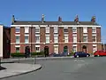 c. 1850 | A terrace of four brick houses with stone dressings and a slate roof. They have three storeys and nine bays, the outer two bays at each end projecting forward. The windows are sashes with wedge lintels. The entrances are round-headed with fanlights. The garden walls are included in the listing.[14] | II | |