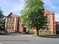 1911 | The library incorporates a house dating from about 1840. The library is in red Ruabon brick and buff terracotta on a steel frame, with a green slate roof, and is in Edwardian Baroque style, and the house is in buff sandstone in Scottish Tudor Gothic style with blue slate roof. The library has a T-shaped plan, with a two-storey range facing the road and a single-storey wing to the south. The house is attached to the library, and has an L-shaped plan, and a three-storey round tower in the angle. The main front has three wide bays, with the entrance in the middle bay, which has an elaborate surround and a segmental open pediment. The outer bays project under an open pediment, and contain a Venetian window in the upper floor.[39][40] | II | |