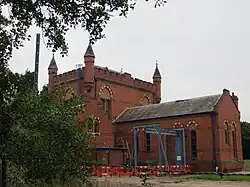 1895 | The water pumping station is in Ruabon red brick with dressings in blue and buff brick, stone and tile, and has a hipped slate roof. It has a rectangular plan, and a boiler house, coal store, and borehole house at the rear. There are two storeys and basement, and two bays. It has an embattled parapet, and corner corbelled bartizans with conical roofs and finials. The windows are mullioned and have polychromatic heads and tympana.[4][31] | II* | |