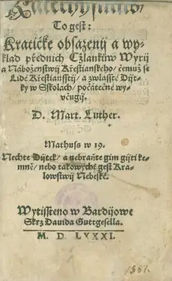 - ^ Durovic, Lubomir (2009). "BARDEJOV CATECHISM (1581) - THE FIRST SLOVAK PRINTED BOOK (Bardejovsky katechizmus (1581) - prva slovenska tlacena kniha)". Slovenská Reč (Slovak Language). 74 (4): 204–218.