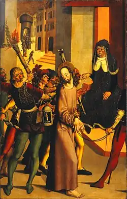 In contrast to earlier interpretations stating that the picture portrayed Christ before Caiaphas, according to Jan Royt[15] it is in fact the theme of Christ before Annas (according to St John's Gospel), because Caiaphas is usually shown in a robe torn at the chest or with a mitre (Giotto, Dürer). A group of armed men with torches has brought Christ, his hands tied, and turn to the enthroned high priest with gestures of their arms and hands. The panel is damaged, having been cut down to a smaller size; it is consequently missing most of the figure holding the rope. Christ looks back at a man holding a lamp with a burning candle – this man with a lamp is modelled on an engraving by Martin Schongauer. The men surrounding Christ are wearing short tunics and close-fitting leggings typical of Renaissance fashion in the early 16th century. Christ's long robe partially indicates the volume of his body. A view through to the street beyond shows a group of armed men in front of whom an old man, probably St Peter, is crossing.[15]