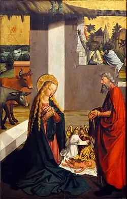 The Adoration of Christ takes place against the background of simple architecture beyond which there unfolds a landscape with a church, cliffs and a lake. The birth of Christ is set in a hut indicated merely by a thatched roof. On the left there stand a donkey and an ox looking on behind a low tumbled-down wall. The naked Baby Jesus lies on a white swaddling cloth and, behind him, two kneeling angels hold a blank inscription band. On the right there stands Saint Joseph, covered in a long red robe, with a serious expression on his face. Portrayed in profile, his head is disproportionately small compared with Mary as well as with the size of his own body. The lovely face of the Virgin Mary, similar to loving Madonnas, is different to the portrayal of Mary in other panels of the altarpiece. Two shepherds are approaching the hut, one of whom points to a pair of angels on the partial roof.