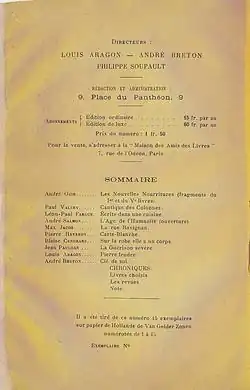 In 1923, the magazine was incurring reduced sales so Breton decided to limit the publication to special issues. The first appeared on October 15, 1923; the next appeared in June 1924, and no others followed.[1]