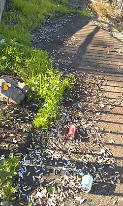 Cigarette butts are the most littered item in the world, with an estimated 4.5 trillion discarded each year.[1] Estimates of the required time for cigarette butts to break down vary, ranging from 5 to 400 years for complete degradation.[2][3]