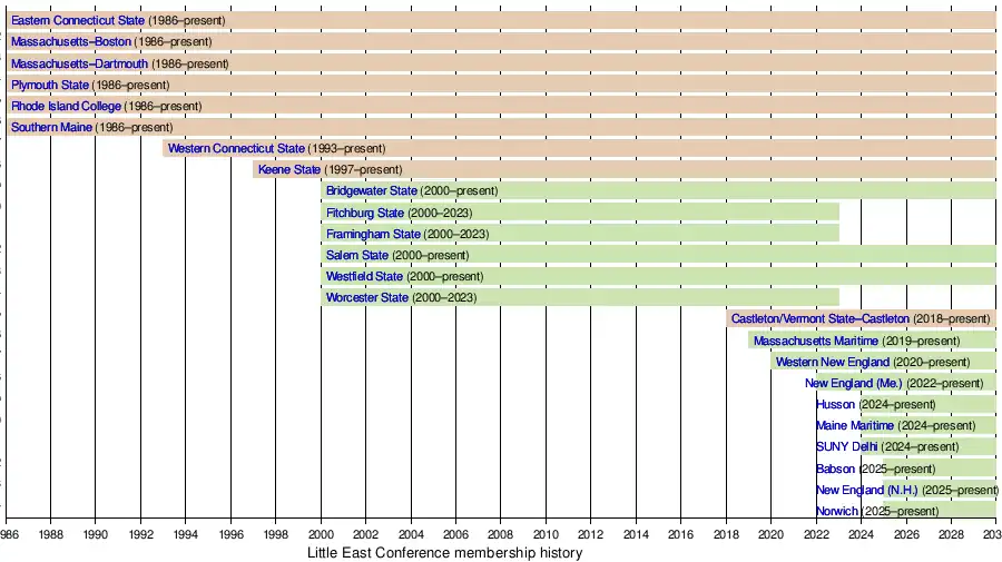 - 2025 β Five institutions joined the Little East as associate members (and/or added other single sports into their associate memberships), all effective in the 2025β26 academic year: