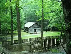 The Walker Sisters Place (sometimes referred to as the King-Walker Place after its primary builders) was the home of five sisters who refused to sell their 166-acre (0.7 km2) plot to the national park and maintained their traditional mountain life into the 1950s. In 1946, the Saturday Evening Post published an article on the Walker sisters that drew a flood of tourists to the area.[6] The "kitchen" part of the cabin was built in the 1840s by early settler Brice McFalls. The larger cabin was built in the 1850s by Wiley King. His sons completed the chimney, and his son-in-law, John N. Walker, built the porch and merged the larger cabin with the smaller McFalls cabin.[2] By 1921, the cabin and farm had passed to five of Walker's daughters—Margaret Jane, Polly, Louisa, Hettie, and Martha—who had lived on the land their entire lives.[6] The National Park Service assumed control of the land when the last of the Walkers died in 1964.[2]