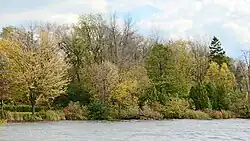 Peterborough is about 50 kilometres (31 mi) north of Lake Ontario and south of the Kawartha Lakes. The Otonabee River flows down from the Kawartha Lakes through Peterborough, where it is joined by Jackson creek at Little Lake, and continues south to Rice Lake. From there the Trent River leads to Lake Ontario.[1] The Otonabee River drops by 144 feet (44 m) from Katchewanooka Lake to Little Lake.[2] The Trent Canal leaves the Otonabee River upstream from Little Lake and runs parallel to the river, then rejoins it in Little Lake. With the Otonabee to the west and the canal to the east, the district of Peterborough known as East City is an island.[3]