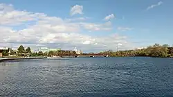 In the 1820s, before a dam had been erected at the locks below Little Lake, the Otonabee was shallow and could easily be forded on foot opposite the old steamboat landing beside the Shaw & Fortune steam mill.[14] In 1833 and 1835 L.H. Baird made a survey of the route of what would become the Trent–Severn Waterway connecting Lake Huron to Lake Ontario, and following his recommendation locks were built at Bobcaygeon, Little Lake, Hastings and Chisholm Rapids.[15] Work began on a dam and lock at Whitla's Rapids in 1837, now Scott's Mills lock, where a 3 feet (0.91 m) drop in the river prevented steamers from reaching Little Lake, but proceeded slowly.[16] Construction lasted from 1837 to 1844.[17] Three piers and a boom were completed in 1852 by Public Works Canada.[18]