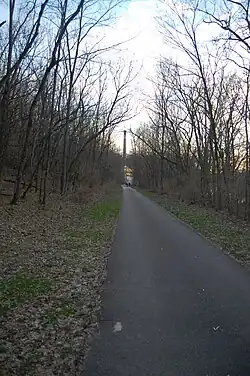 Together with the Ohio Department of Natural Resources, the local governments of Xenia and Yellow Springs purchased land along the abandoned railroad from 1973 to 1983.[12] In 1979, the land became an Ohio State Park.[7] In 1979, ODNR studied developing the corridor as a scenic railroad up to 27.8 miles (44.7 km) long from Loveland to Corwin, as well as a bike trail and bridle trail. However, ODNR prioritized the trails, allowing the bankrupt Penn Central Transportation Company to salvage the rails and ties, which made building new tracks cost-prohibitive.[13][14] The trail was strongly supported by residents and officials in Loveland, where a park was being developed around the Loveland Bike Trail, but was opposed by residents of Terrace Park, who were concerned about crime. The first 13 miles (21 km) of the trail from Morrow to Loveland was paved in late 1983[15][16] and officially opened on May 16, 1984.[17][18][19] Two years later, the Ohio Department of Transportation received a grant from the Federal Highway Administration to complete the trail.[12]