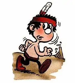 Leo Baxendale created Little Plum in 1953 as a puny cartoon character in a dangerous cartoon world.[2] It first appeared in issue 586, dated 10 October 1953. The comic strip employed a caricature of English language spoken by American Indians, notably replacing the word "the" with "um". Baxendale dreamed him up claiming he was a mixture of Hiawatha and Dennis the Menace and gave him into the editing team. Unsure of the name, Baxendale gave it in to the then Beano editor under the working title 'Booster' before the strip was officially titled 'Little Plum, Your Redskin Chum'.[3] They consisted of Plum, a ten-year-old member of the Smellyfoot tribe and the misadventures he got up to trying to prove himself a valuable member. After Baxendale left The Beano in 1962, Robert Nixon drew a few strips before Ron Spencer took over that same year. The strip originally finished in 1986, but it continued to appear in the Beano annuals up to 1994, and reappeared for a short time in 1998 under the name 'The Legend of Little Plum', drawn by Tom Paterson.