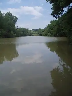 Beyond Walland, Little River cuts a wide gap in Chilhowee Mountain before descending into the Maryville-Alcoa flatlands. As it steadies, the river no longer displays the extreme clarity and attractive rocky bottom of its upper reaches and resembles a more typical stream in a moderately rolling, somewhat rural area. From the old mill dam at the Peery's Mill site north of Walland to the river's mouth at Ft. Loudoun Lake (approximately 19 miles), the river is generally navigable with a canoe, with the exception of a dangerous low-head dam at the Rockford Manufacturing Company in Rockford.[16] Little River flows through farmland, under U.S. Highway 411, and passes through the cities of Maryville and Alcoa before reaching Rockford.