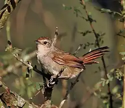 The little thornbird is 13 to 14 cm (5.1 to 5.5 in) long and weighs about 14 to 16 g (0.49 to 0.56 oz). It is the smallest member of its genus. The sexes have the same plumage. Adults have a wide dull buff-whitish supercilium that extends beyond the eye and an indistinct dull brown stripe behind the eye on an otherwise light brownish face. Their forehead is light rufous with pale streaks, their crown and back dull brown, and their rump and uppertail coverts rufescent-tinged brown. Their wings are mostly shades of brown with darker brown primary coverts and some rufescence. Their tail's central pair of feathers are dull brown, the next pair mostly rufous with a brownish outer third, and the rest bright rufous. Their throat and belly are dingy whitish, their breast slightly darker, and their flanks and undertail coverts whitish with a tawny-brown tinge. Their iris is greenish gray to dark brown, their maxilla black to dark gray, their mandible light horn-gray to gray, and their legs and feet gray to pinkish gray. Juveniles have slightly darker upperparts and slightly grayer underparts than adults.[6][7]