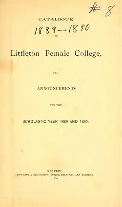 - ^ Rives, Ralph Hardee (1962). "Littleton Female College". The North Carolina Historical Review. 39 (3): 363–377. JSTOR 23517290.