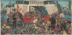 When Emperor Ling died in 189, the land fell into chaos. Therefore, Liu Bei raised an army and joined the Campaign against Dong Zhuo.[9][Sanguozhi zhu 6] Later, when he returned to Gaotang County, the commandery was overwhelmed by rebels, so he opted to move north to join an old friend, the warlord Gongsun Zan.[9] In 191, they scored a major victory against another warlord Yuan Shao (the leader of the former alliance against Dong Zhuo) in their struggle for control of Ji Province and Qing Province.[9] Gongsun Zan nominated Liu Bei to be the Chancellor () of Pingyuan State and sent him to join his subordinate Tian Kai in fighting Yuan Shao's eldest son Yuan Tan in Qing Province.[9][c] In defending against the governor of Ji province, Yuan Shao he fought many battles with distinction. Therefore, he was appointed probationary Prefect (令) of Pingyuan and later was made the concurrent Chancellor (相).[Sanguozhi 14]